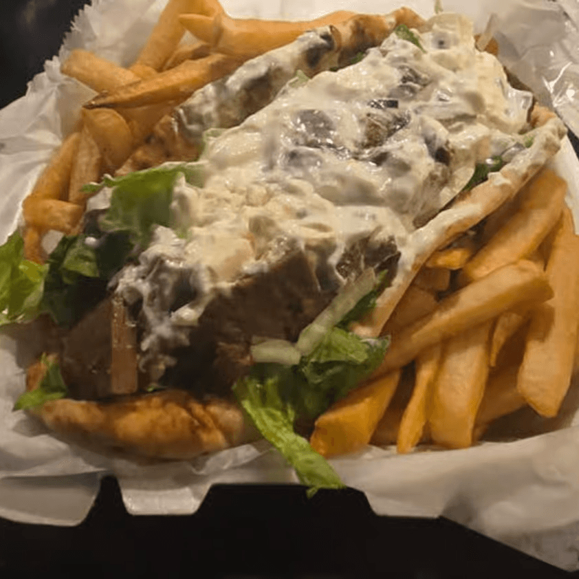 Pita bread, tzatziki sauce, romaine lettuce, tomato, grilled or raw onion, feta cheese