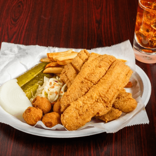 Two large fish fillets, fries, hush puppies, coleslaw, onion, & pickle