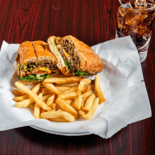 Hoagie bun, cheese, romaine lettuce, tomato, grilled onion, bell pepper, mayo
