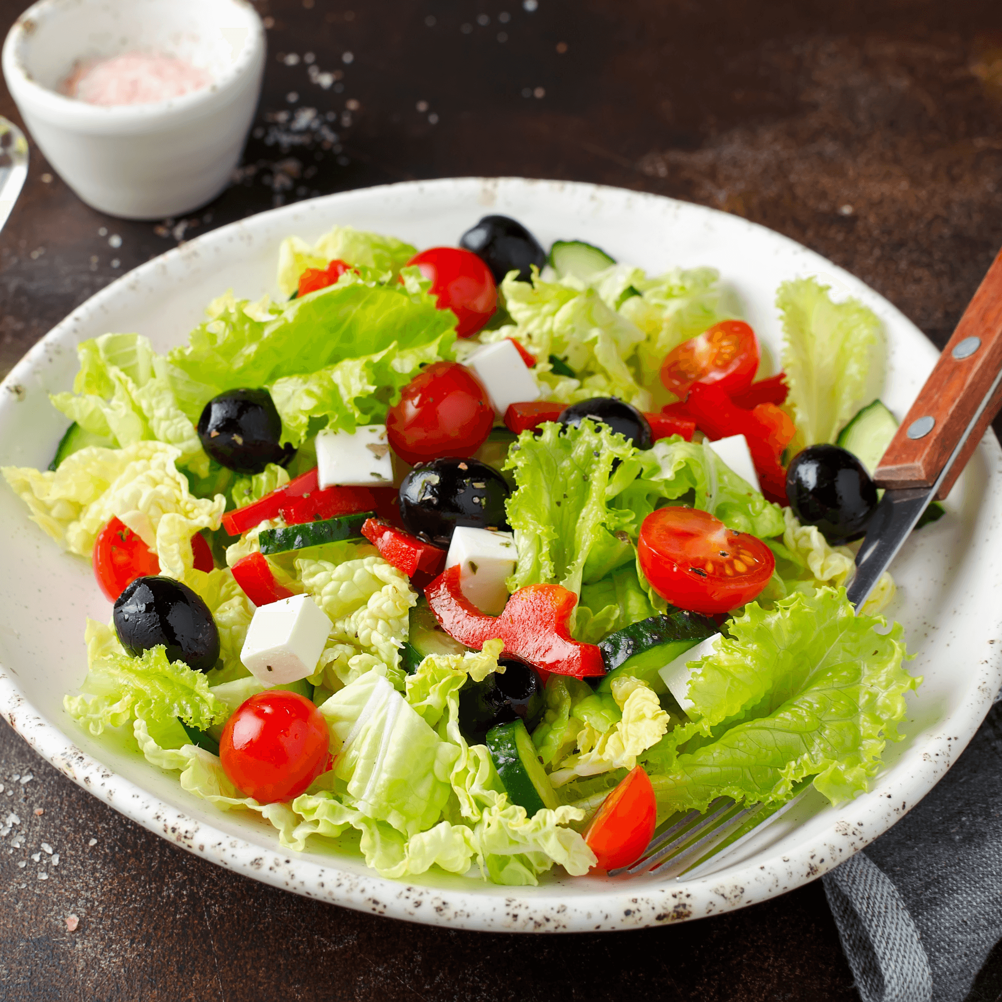 Fresh-cut romain lettuce, cherry tomatoes, kalamata olives, feta cheese, banana peppers, red onion